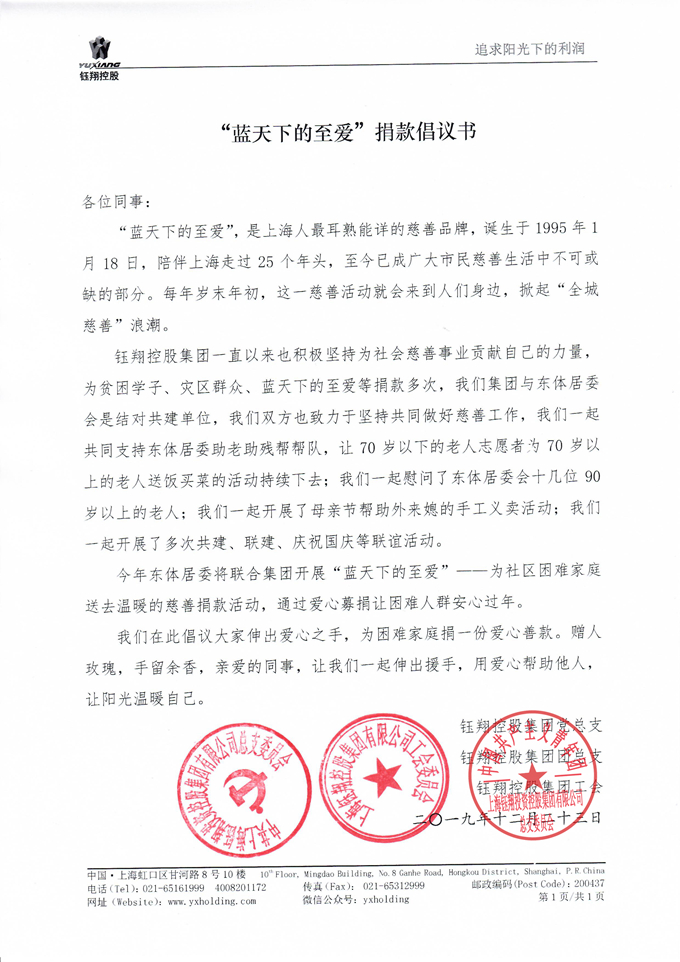 12月23日,鈺翔控股集團(tuán)黨總支、團(tuán)總支、工會(huì)聯(lián)合倡議,要求集團(tuán)黨團(tuán)員積極參與“藍(lán)天下的至愛”慈善捐款活動(dòng),經(jīng)過(guò)幾天的發(fā)動(dòng)和收集,共收到愛心捐款近4000元,12月27日,集團(tuán)黨總支秦祖煌書記愛心善款轉(zhuǎn)交到了東體居委黨總支范晟華書記的手里。此次活動(dòng)由鈺翔控股集團(tuán)黨總支與曲陽(yáng)路東體居委會(huì)聯(lián)合主辦,目的是為社區(qū)困難家庭送去溫暖,讓困難人群安心過(guò)年。